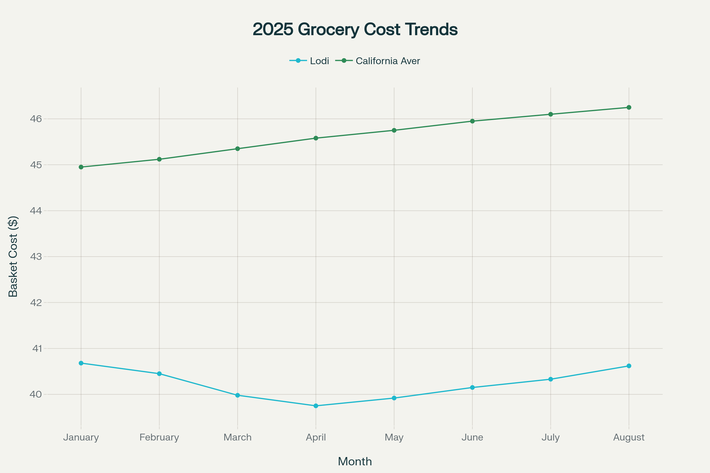 Based on comprehensive tracking of core grocery items, Lodi has experienced a modest 0.1% decrease in grocery basket costs during 2025, contrasting sharply with broader California trends where food prices have risen 2.9% year-to-date[1]. This analysis examines current prices and 2025 trends across three geographic areas using data from 11 essential grocery items.